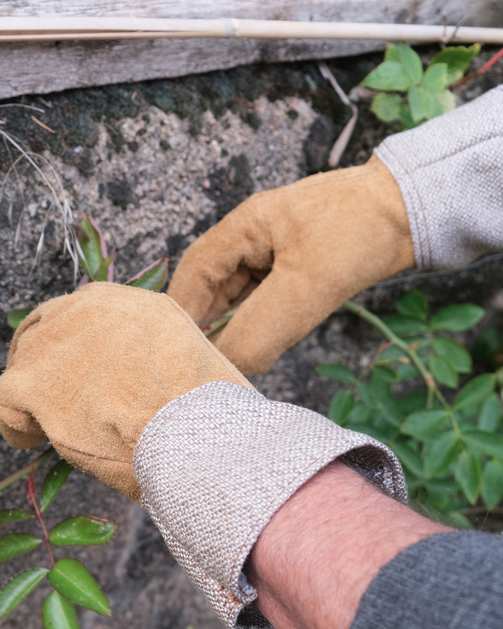 Gants de jardinage avec paume et main en croûte de cuir noisette et manchette toile Sunbrella spécial