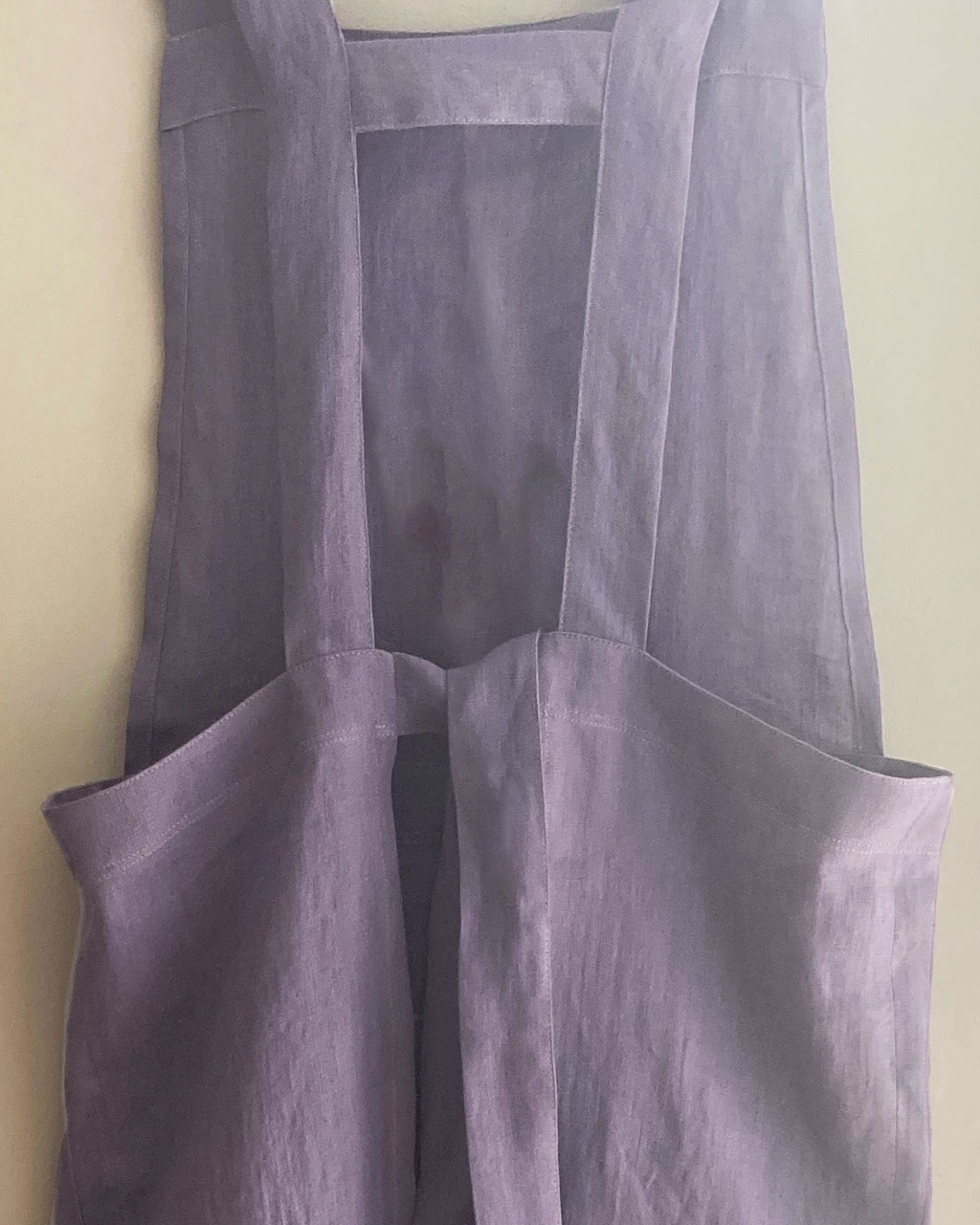 Tablier de jardin, 2 poches à soufflets. Dos à nouer. Points d'arrêts sur poches et fentes.