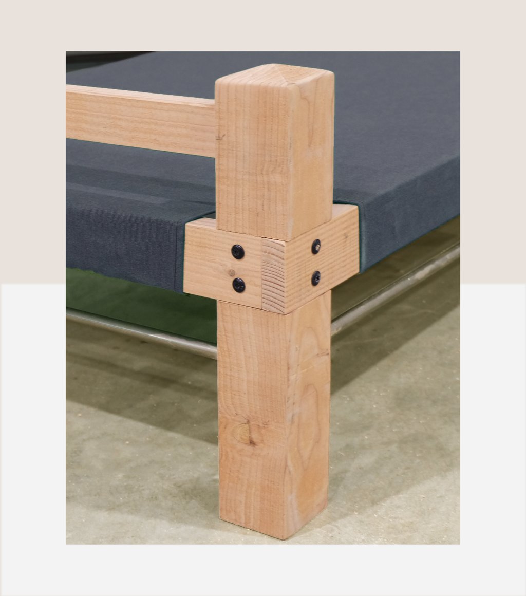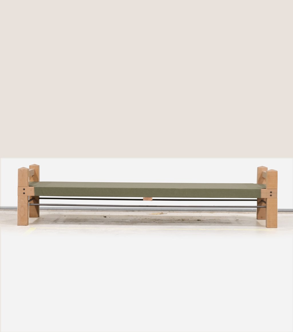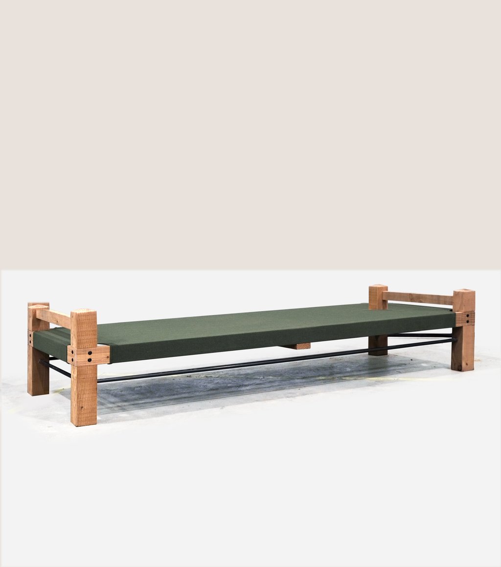 À mi-chemin entre le lit de camp d'inspiration militaire et le lit de repos typé marocain, ce nouveau daybed fera sensation. À la place d'une assise classique en traverses de bois, une belle toile Sunbrella solide et faite pour vivre dehors, allège le tout et est tout de suite confort.