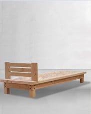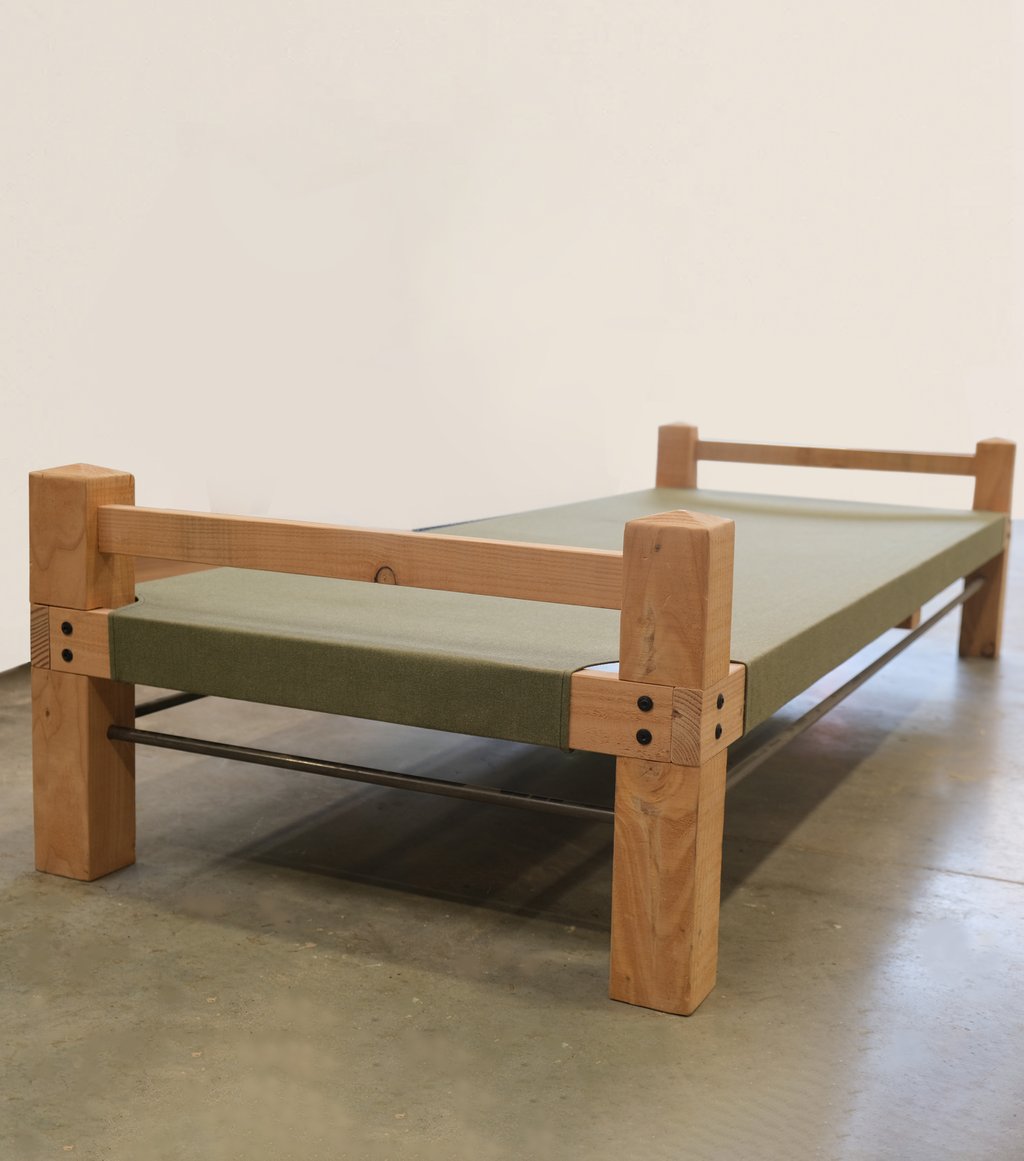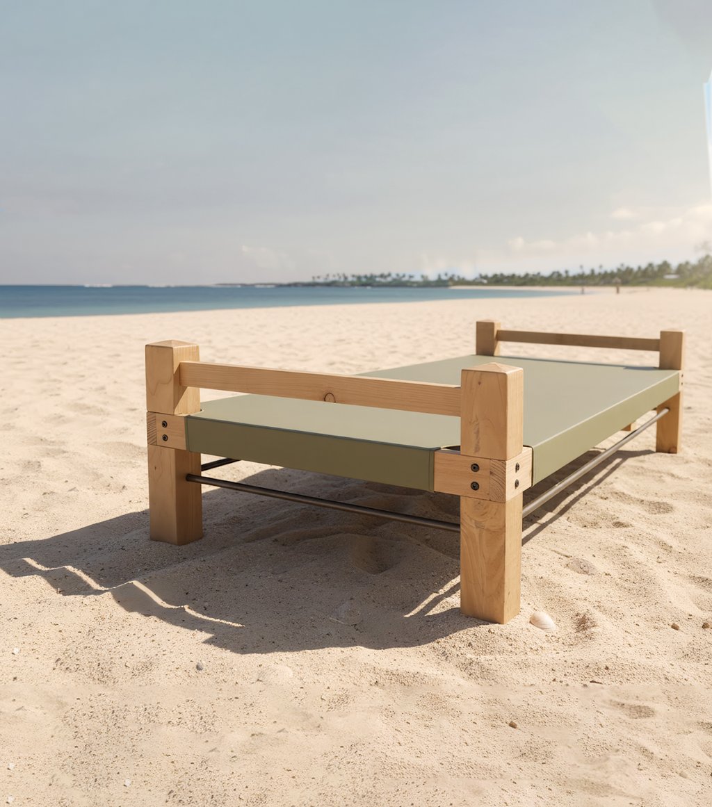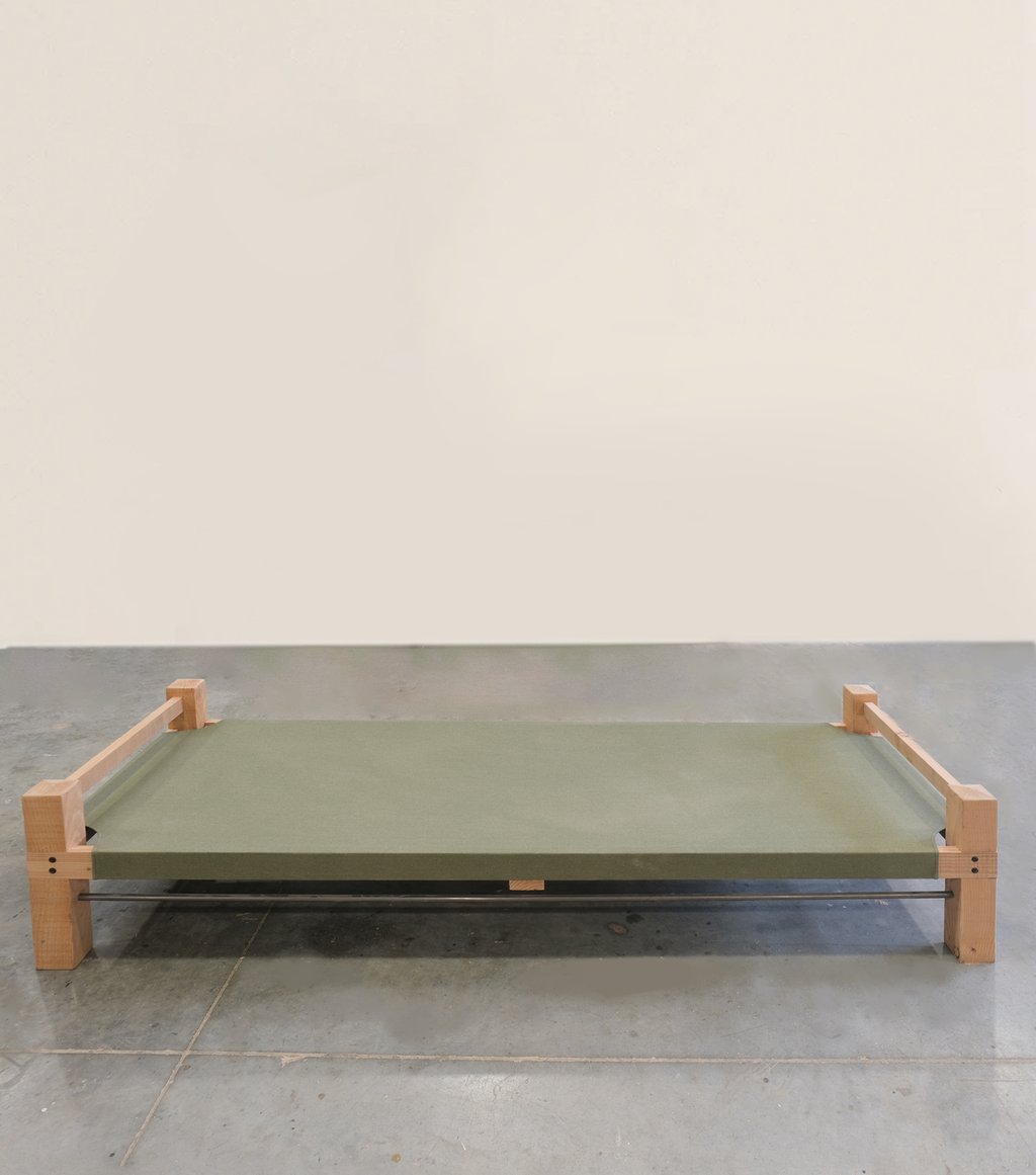 À mi-chemin entre le lit de camp d'inspiration militaire et le lit de repos typé marocain, ce nouveau daybed fera sensation. À la place d'une assise classique en traverses de bois, une belle toile Sunbrella solide et faite pour vivre dehors, allège le tout et est tout de suite confort.