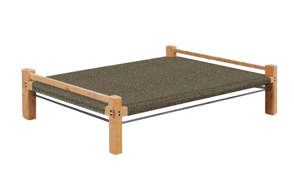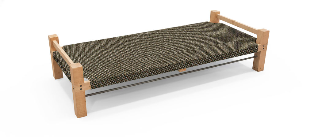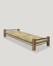 À mi-chemin entre le lit de camp d'inspiration militaire et le lit de repos typé marocain, les lits Hosta de Ladivine sont des pièces multitâches, ultrafonctionelles. Ils peuvent être utilisés comme lits, canapés, chaises longues, ou bancs. À la place d'une assise classique en traverses de bois, une solide toile Sunbrella allège le tout et s’étire aux quatre coins pour mettre en valeur la trame de la toile, souvent armurée, aux reliefs changeants. Un système de cordage sous l'assise a été conçue pour un bon maintien.
