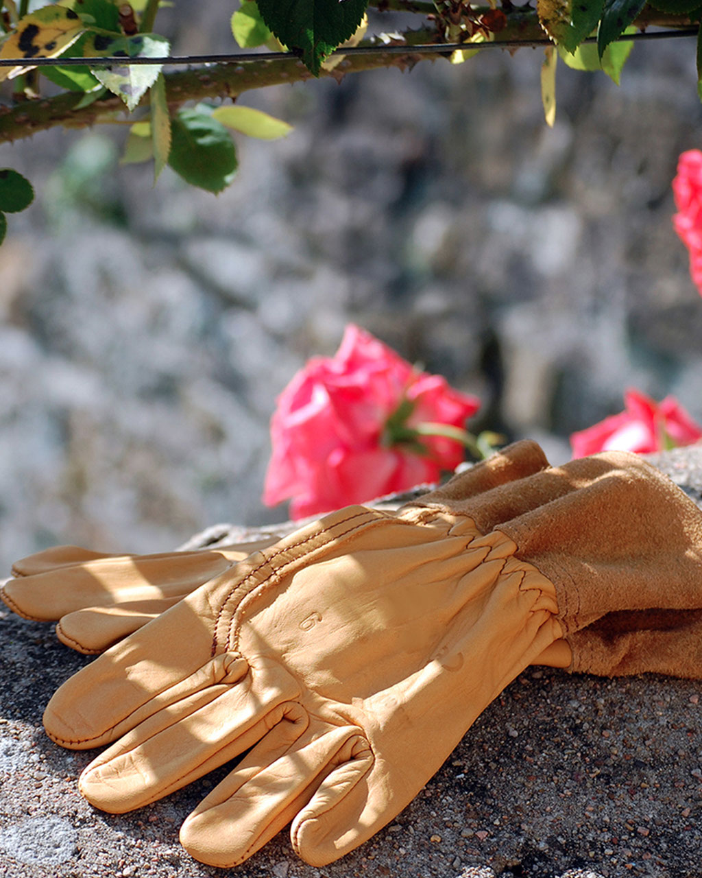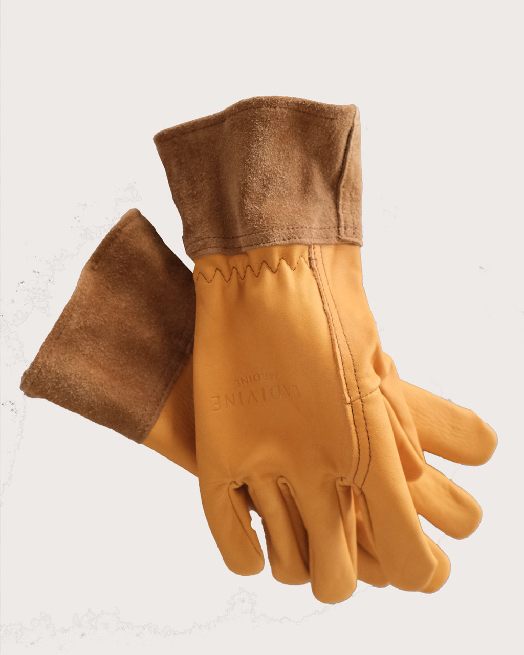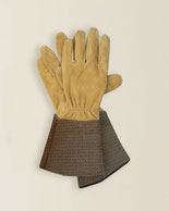 Gants de jardinage avec manchette en croûte de 10 cm de haut assurant la protection d’une partie de l’avant-bras. Élastique de serrage sur le dos au niveau du poignet. Main en cuir de vachette cognac/camel avec manchette en couleur noisette ou main en cuir de chevreau blanc et manchette en croute de cuir gris. Gants de travail très esthétiques.