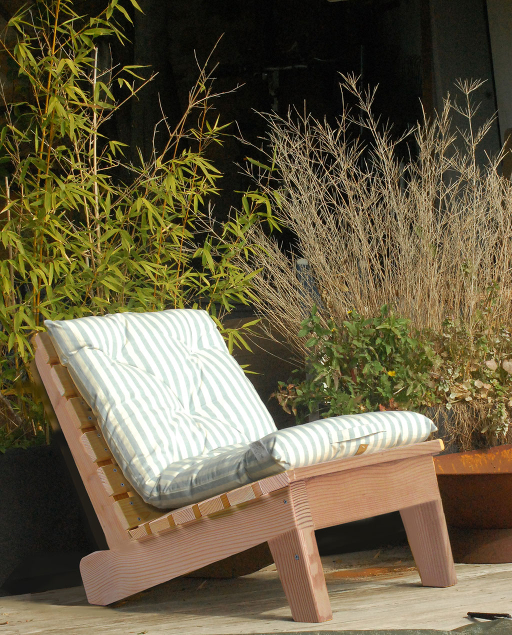 Nous avons pensé qu'un fauteuil un peu bas, avec un style dépouillé, pourrait bien aller avec des places extérieures minimalistes, des maisons eco conçues, du bardage peint sur les façades.